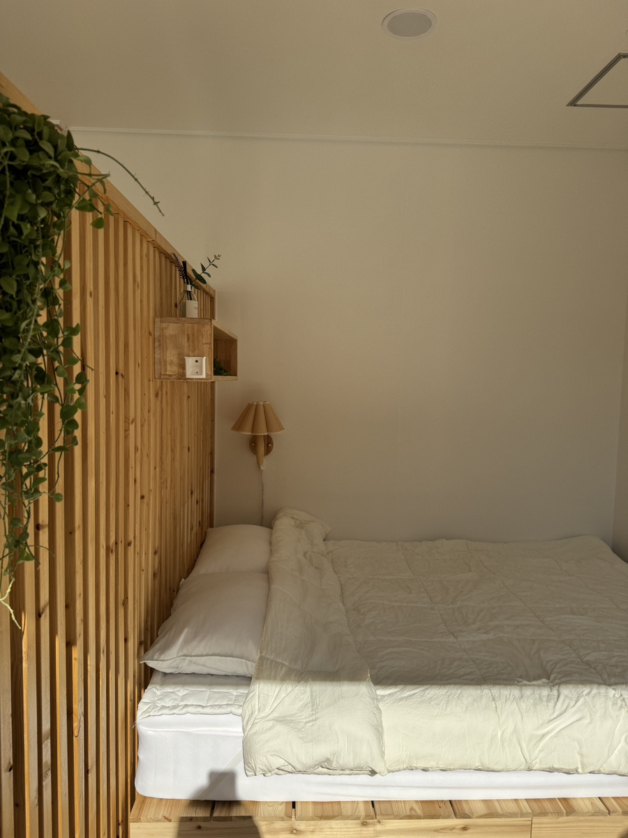 침실에 우드 가벽을 설치하여